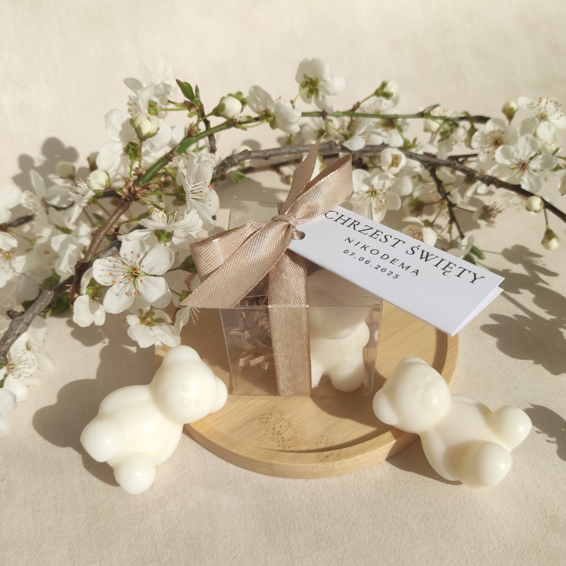 Nasze woski w kształcie misia sprawdzą się doskonale jako podziękowania na Baby Shower, Chrzest Święty lub pierwsze urodziny dziecka. To wyjątkowy prezent dla bliskich – estetyczny, pachnący i tworzony z sercem w naszej pracowni w Trójmieście.