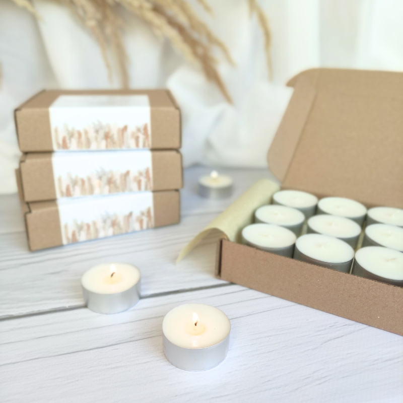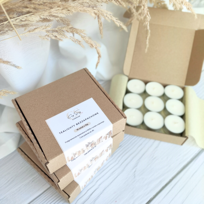 Nasze tealighty są w 100% naturalne, wykonane z wosku sojowego, a cały proces produkcji, od ręcznego przygotowania knota po wylanie wosku, jest starannie dopracowany. Knoty nasączamy czystym woskiem sojowym, co wyróżnia nasz produkt na tle wielu innych świeczek, które wykorzystują gotowe knoty impregnowane mieszankami wosków, często zawierającymi parafinę.